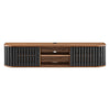 Elevate your entertainment with the Fortitude Wall Mounted TV Stand. With its sliding doors, timber style strip design, adjustable shelves, and a grommet on top for cable management, Fortitude is a practical and stylish solution for any living space. Crafted from MDF and particleboard and designed to mount on the wall, this stand can accommodate TVs up to 70 inches. Includes non-marking foot caps. Assembly required. Set Includes: One - Wall mounted TV stand