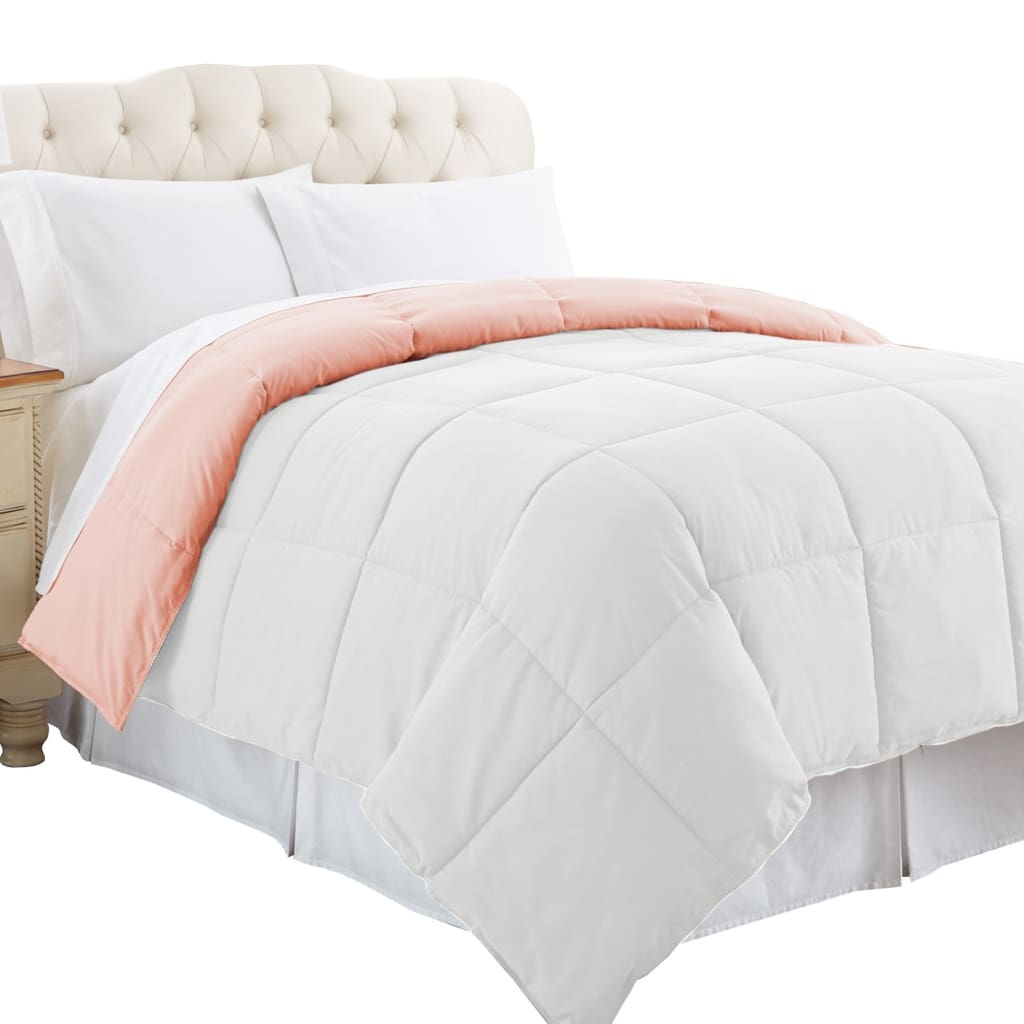 Update your bedroom look in style with the inclusion of this cozy twin size comforter. Made from sumptuous and soft down alternative microfiber for a comfortable experience in elegant white and pink color. It features box quilted details which bestow an appealing look to the comforter. The machine washable feature saves the hassle of dry cleaning while the reversible attribute makes it a versatile and comfortable companion to your bed.