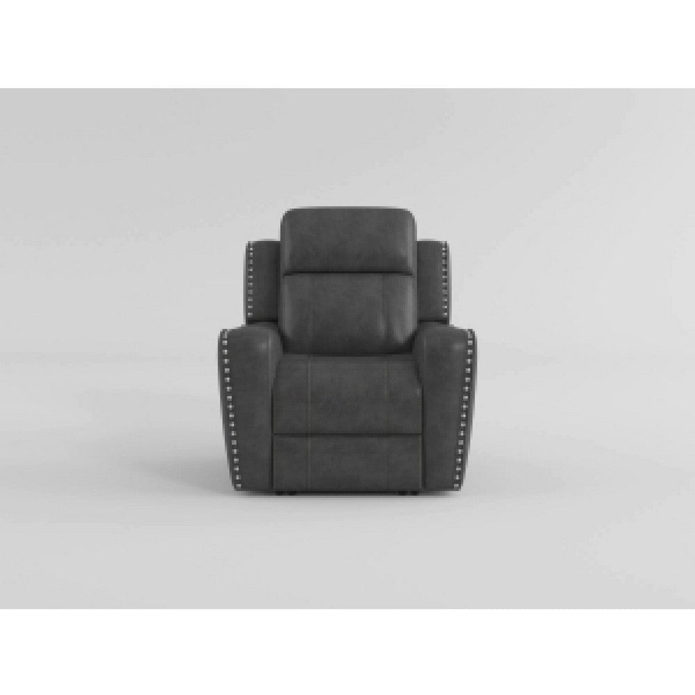 Indulge in sheer warmth with this swivel glider recliner chair. Expertly crafted with a solid wood and plywood frame, it features a Dacron-wrapped high-density foam seat cushion and polished microfiber upholstery in a dark gray finish. Designed with a pull-handle recline mechanism and elegant nailhead trim, this piece offers style and support. Explore our Gimo collection by Casagear Home.