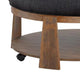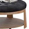 Elevate your living space with this dark gray and brown modern round ottoman coffee table from our Gus collection, a perfect blend of unique design and inviting comfort. Its round shape and button tufted gray fabric top adds both comfort and style, while the brown wood frame exudes character. Its open bottom shelf provides versatile storage or display space. Check out our Gus collection for more.
