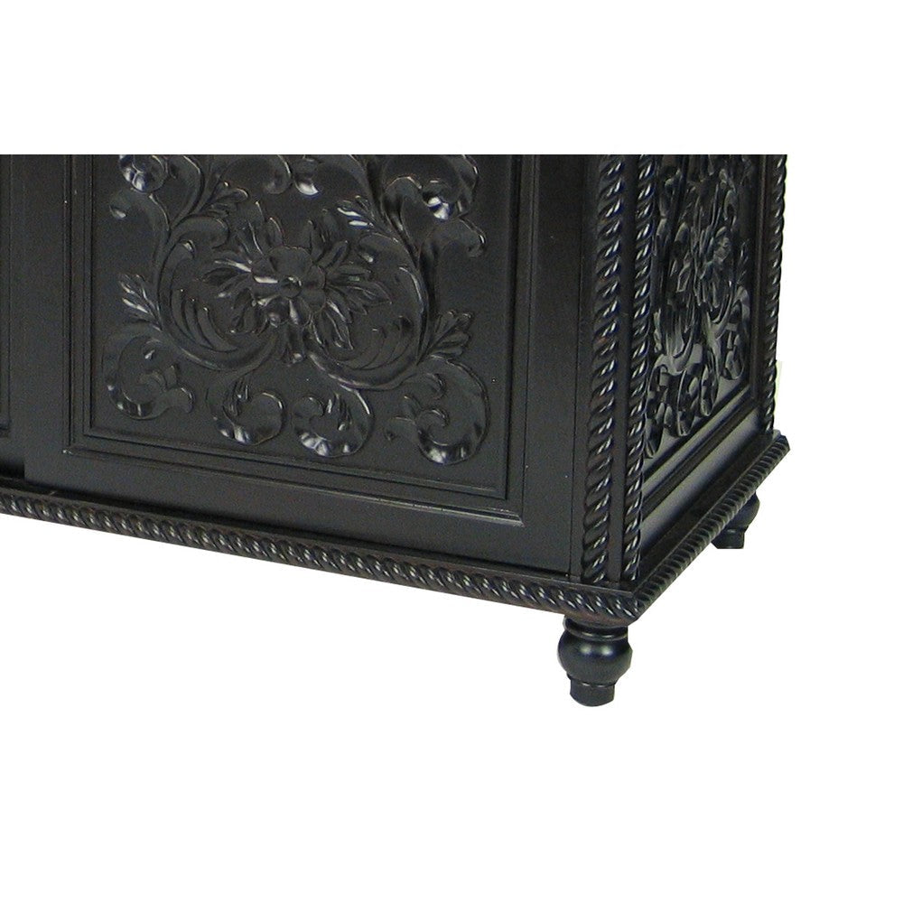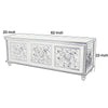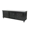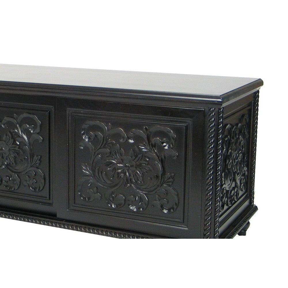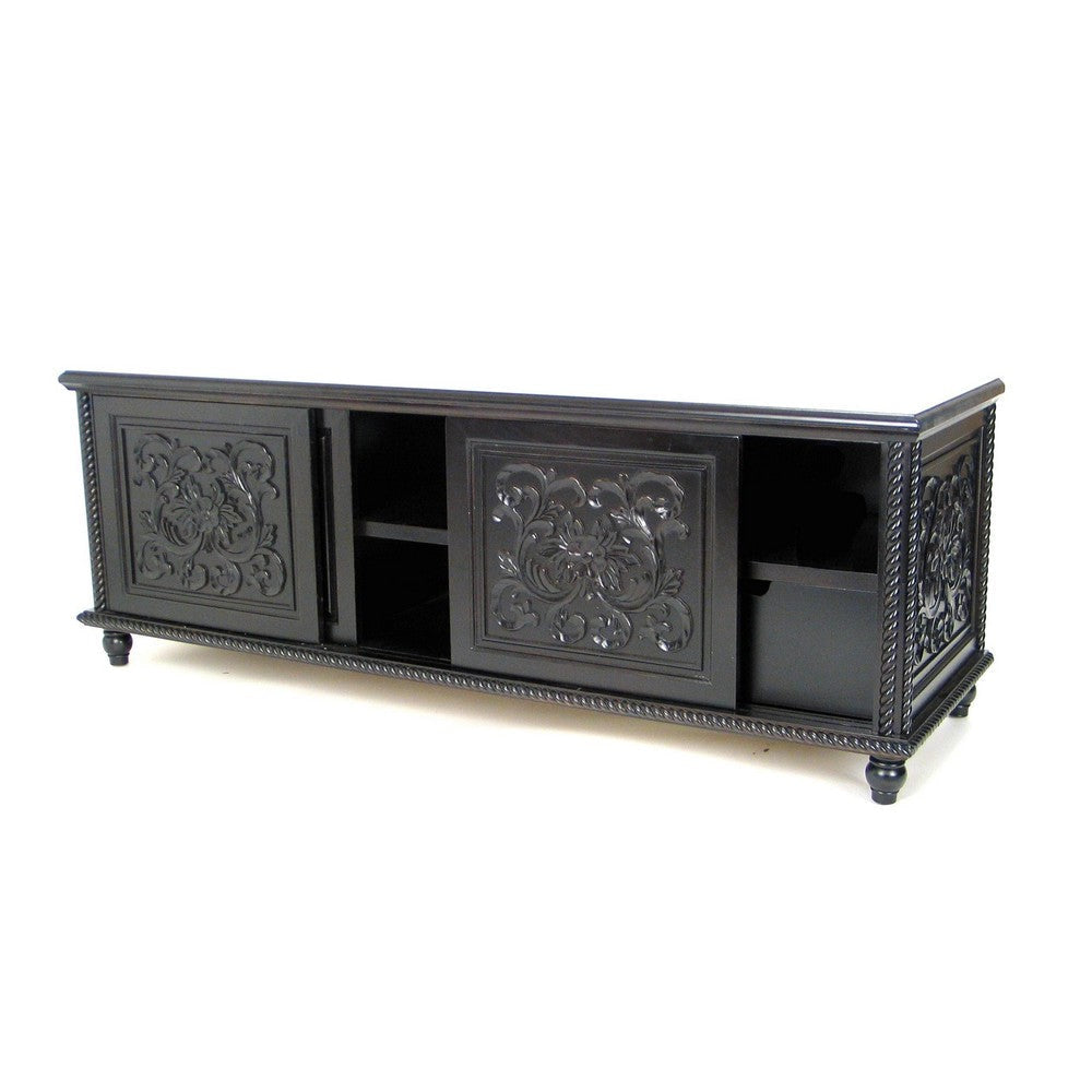 Description:Keep your media devices safe in this sturdy, pine wood constructed TV Console, featuring 3 sliding doors and 2 shelves. Supported on turned legs, it has hand carved wooden floral motifs and molded details to add to its look.