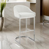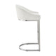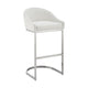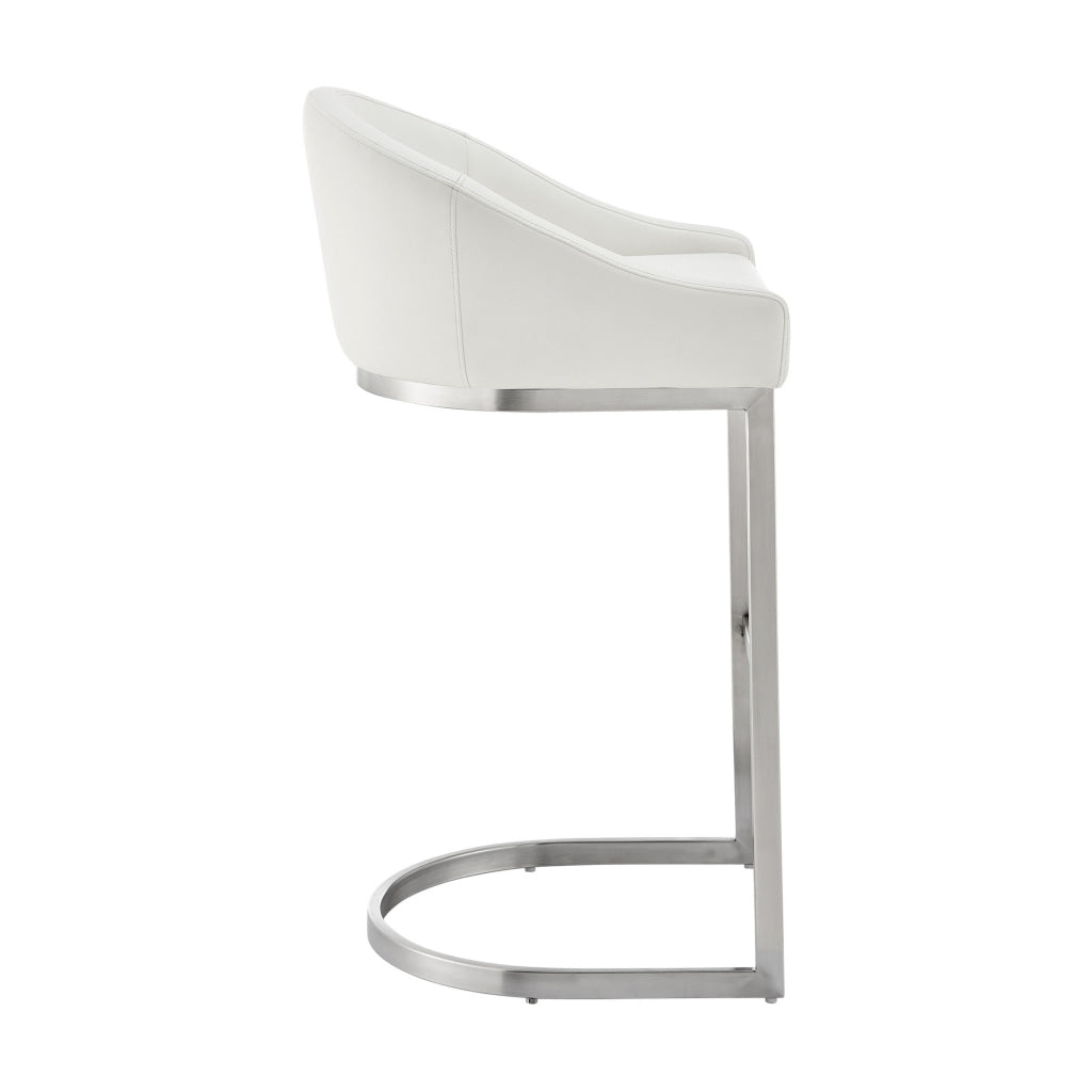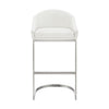 This counter stool chair from our Holo collection is made with brushed stainless steel for a modern look. The crisp white vegan faux leather upholstery elegantly wraps the stylish barrel-style seat, creating an inviting and chic focal point. What sets this counter stool apart is its innovative L-shaped cantilever base, providing a contemporary twist. Check out our Holo collection for more.