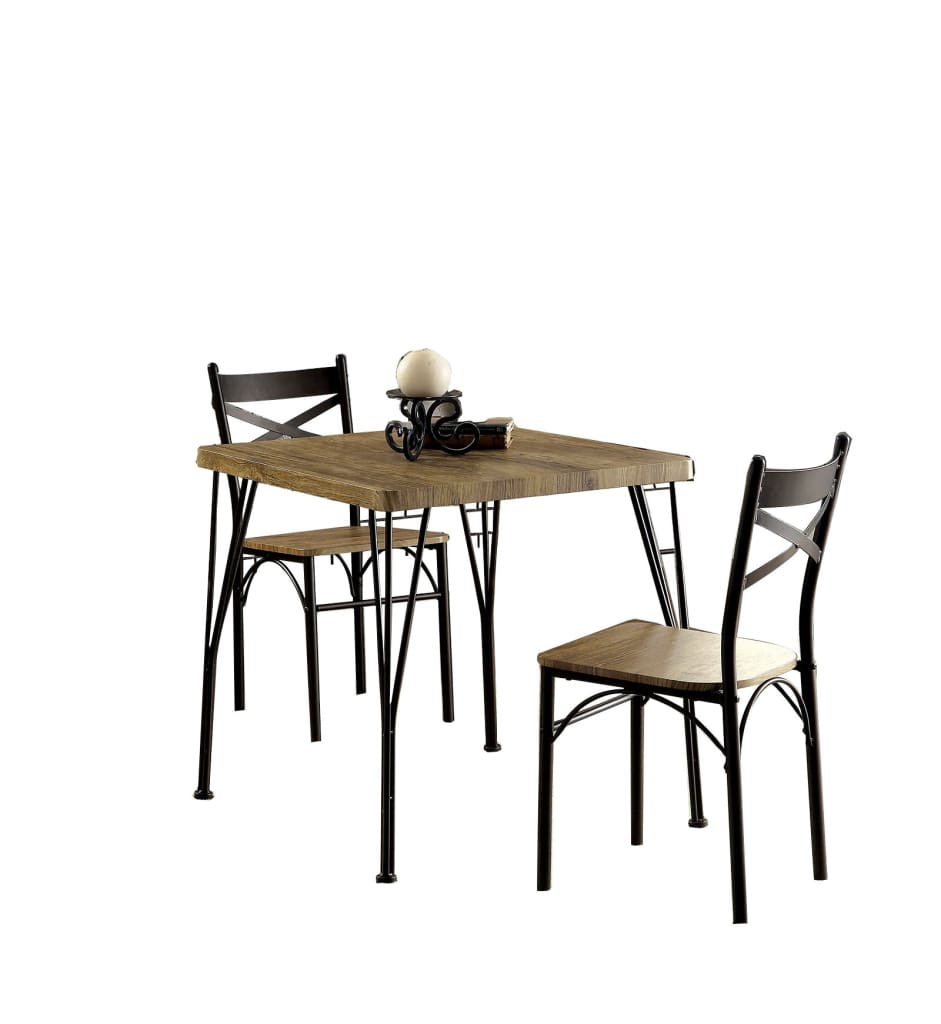 To enhance the charm of your dining room, this 3 piece dining set is the one you must have in your space. Perfectly crafted this dining set comprises two chairs and one square wooden top table. Combining sturdy metal with light tone wood, the table showcases sleek rounded corners supported by unique triple-bar legs. The weathered seats of the chairs complements the design and add contrast to the dark metal frame. Ideal for family meals, this table set showcases casual comfort and reliable support to last for years to come.