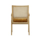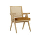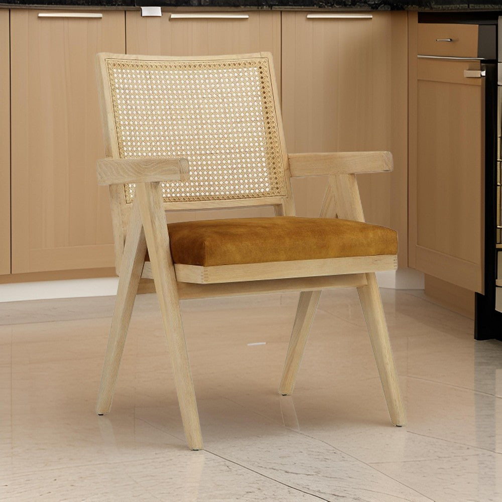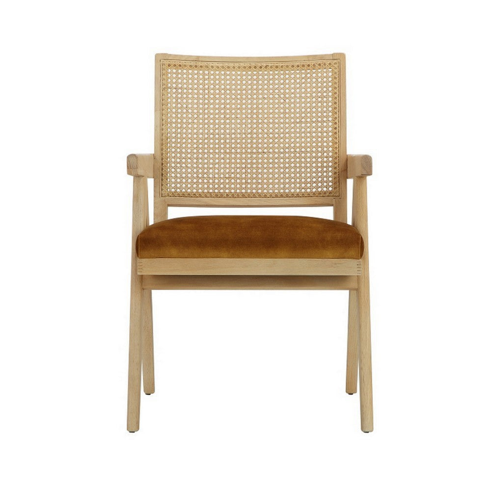 Enjoy easy rest and relaxation with our Isha accent armchair. Made of natural brown oak wood veneer, it features a cane woven back for breathable sitting. The cushioned seat is densely padded and wrapped in a soft golden brown velvet for enhanced comfort. Its straight arms and subtly angled legs bring unmatched comfort to this style statement. Check out our Isha collection for more color options.