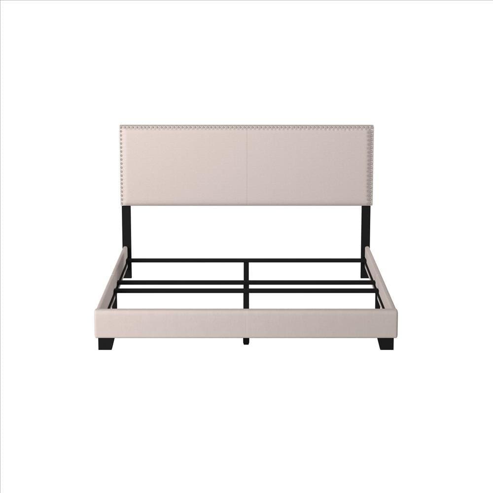 This simple yet chic designed bed is upholstered in Ivory colored fabric and comes with an Individual nailhead trim. With solid wood legs finished in espresso, this Bed provides a calm yet trendy feel. It does not include any other featured product other than a Bed. Item Dimensions: 87.5 in. D x 80 in. W x 49.5 in. H