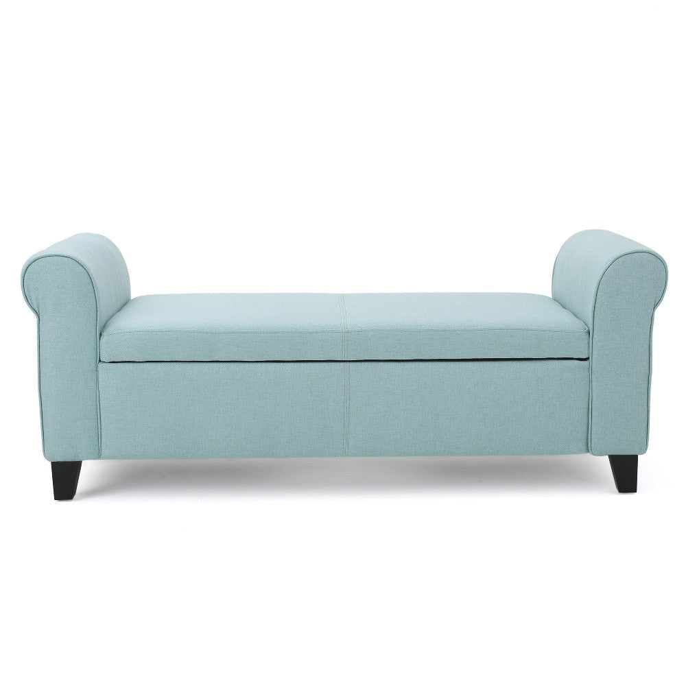 Elevate your living area with this armed storage ottoman bench, an exquisite blend of style and practicality. This elegant piece features smooth, light blue fabric upholstery with gracefully rolled arms, adding a touch of sophistication to any space. Its generous storage compartment is perfect for storing blankets, pillows, or other essentials. Check out our Jacob collection for more options.