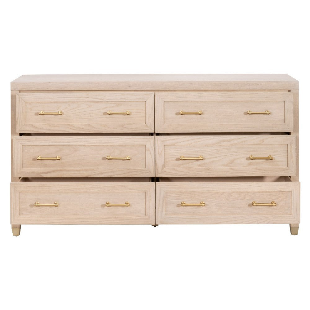 Jae Dresser, 6 Drawers, Light Oak Brown Solid Wood, Brushed Brass