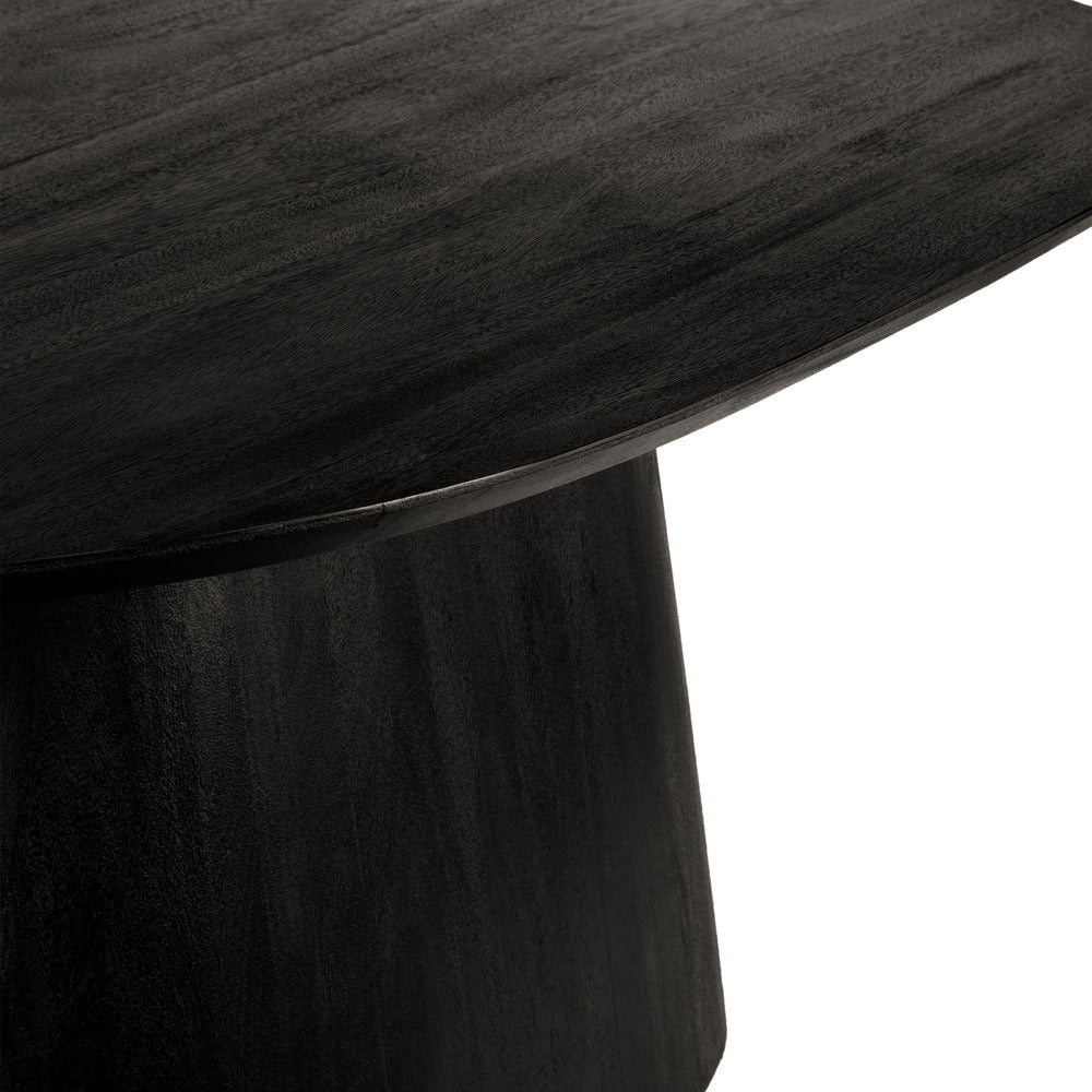 Bring style and effortless modern panache into your dining room, and give your intimate dining experiences with friends, family, and guests an unforgettably contemporary feel with the gorgeously handcrafted dining table from our Jano collection. This piece comes uniquely designed with a one-of-a-kind construction at its base, comprised of a wide flare pedestal foundation that is artfully turned, tilted, and repeated in a dazzling circular pattern. It is finished in a classy, tasteful matte black coloration to accentuate, but not overwhelm, the natural mango wood grain details. The oblong tabletop adds subtle luxury and modern flair to your space, elevating your interior with charisma and refinement.