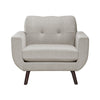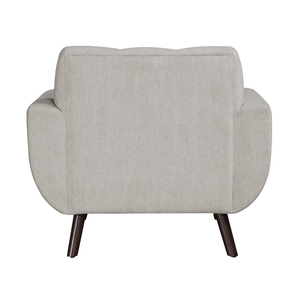 A blend of mid-century charm and everyday comfort, the Jany accent chair features clean lines, retro-inspired curves, and smart detailing. Wrapped in a tan gray textured microfiber, it adds visual warmth with a soft hand feel. The gently scalloped tufted back, angled walnut brown legs, and bold arm framing create a classic silhouette. Explore more in our Jany collection by Casagear Home.