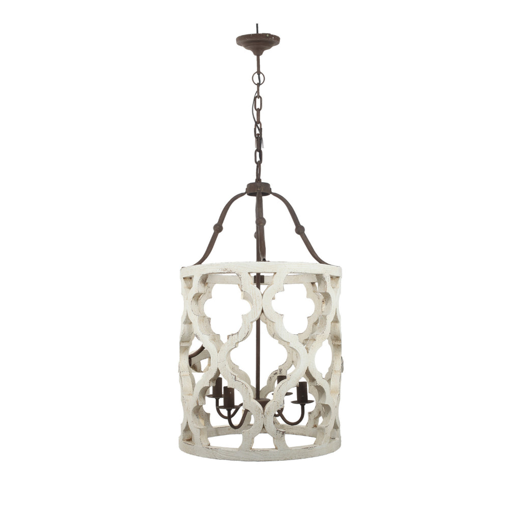 This stunning distressed white wood chandelier will be the perfect addition to your entryway, dining room, or eat-in kitchen. It will add a dramatic rustic and chic element to your decor, perfect for tall ceilings. This Jolette 4-Light Chandelier features a hand carved wood frame in traditional French country motif and a dark brown metal accents. Place the fixture in your entryway or over the dining table for the most effect.