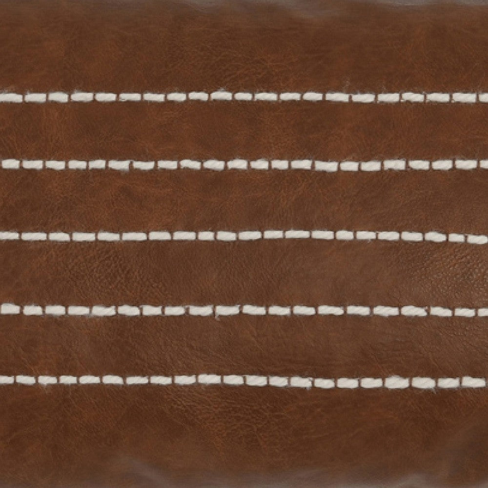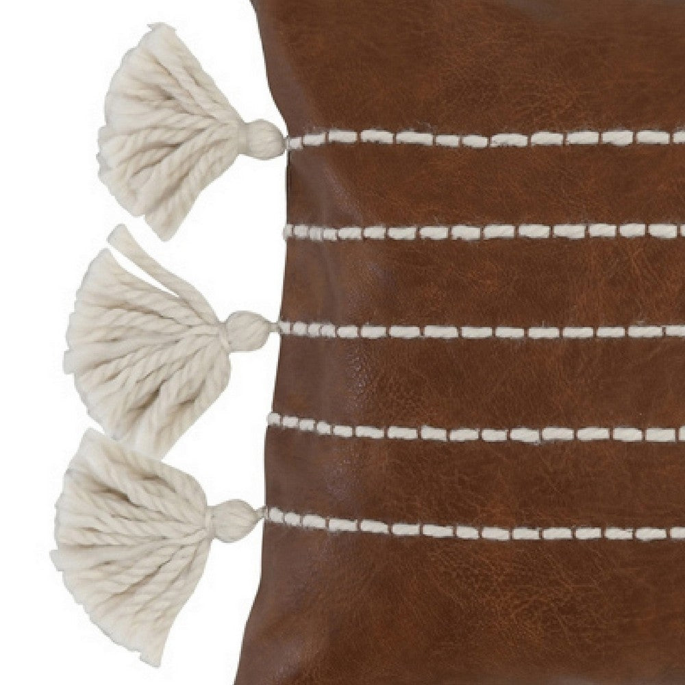With a super soft dark brown vegan faux leather front cover and cotton backing, this gorgeous plush lumbar throw pillow is filled with a soft feather and down insert for super snug relaxation and comfort. It showcases a stylish dashed stripe pattern and playful tassels, giving a tastefully luxurious look to your classic or modern home decor. Check out our Karen collection for more matching pieces.