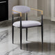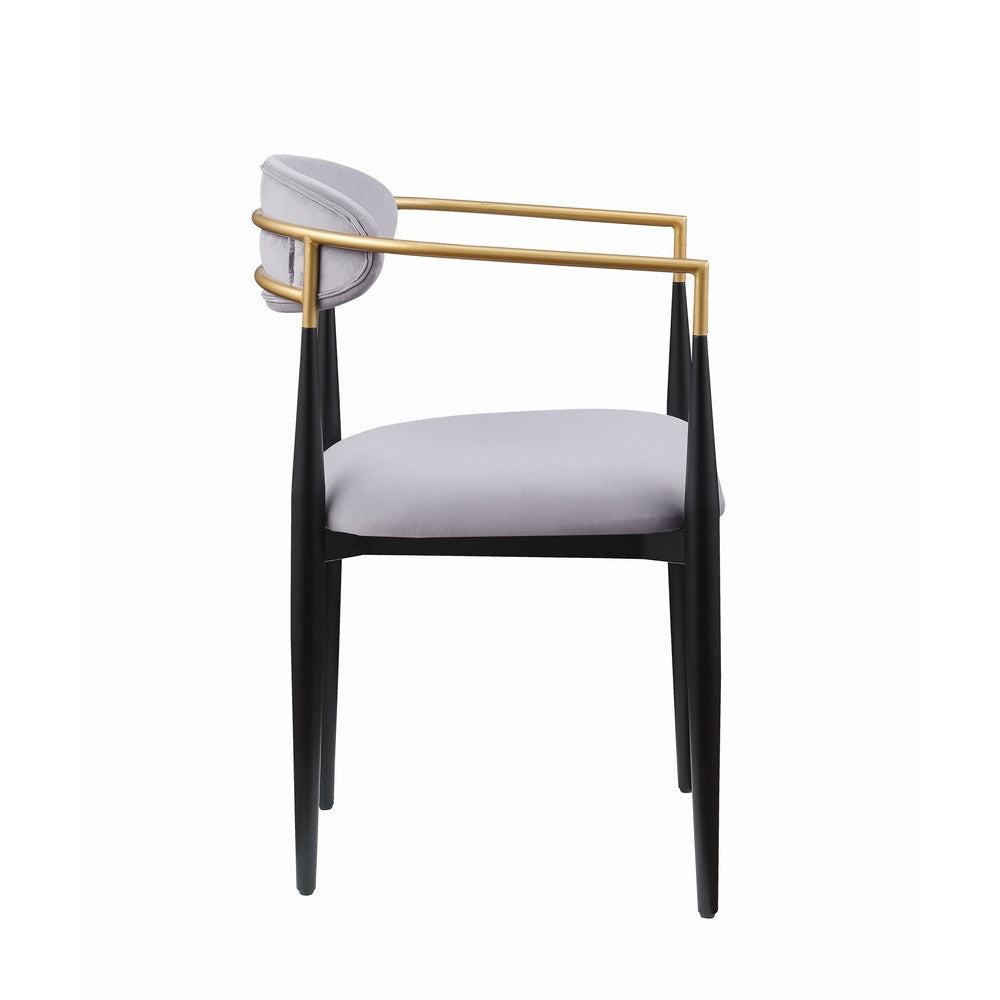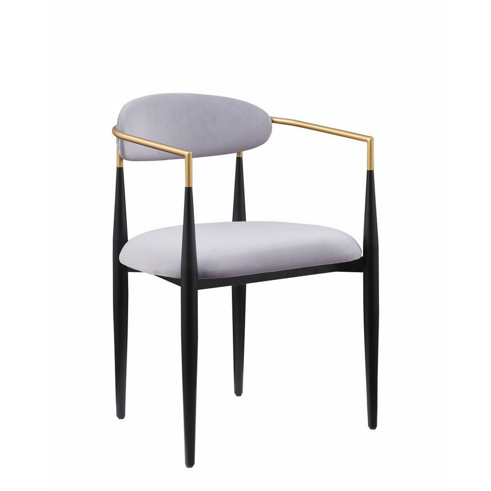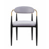 Sink into the plush comfort of the foam padded seat and backrest of this dining chair to elevate your dining experience. Featuring a sturdy metal frame, this armchair boasts unwavering strength for years of enjoyment. Its gray fabric upholstery exudes sophistication, while the gold finished metal armrests add a touch of modern luxury. Check out our Kenny collection for more options.