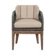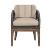 Relax amidst friends and family as you enjoy a meal al fresco with this outdoor patio dining chair. Made from eucalyptus wood in a weathered brown finish with a steel inner frame wrapped in weather-resistant interwoven rope, so its designed to stand up to the elements. The olefin fabric cushions offer UV protection and water resistance for lasting quality. Check out our Kimi collection for more.