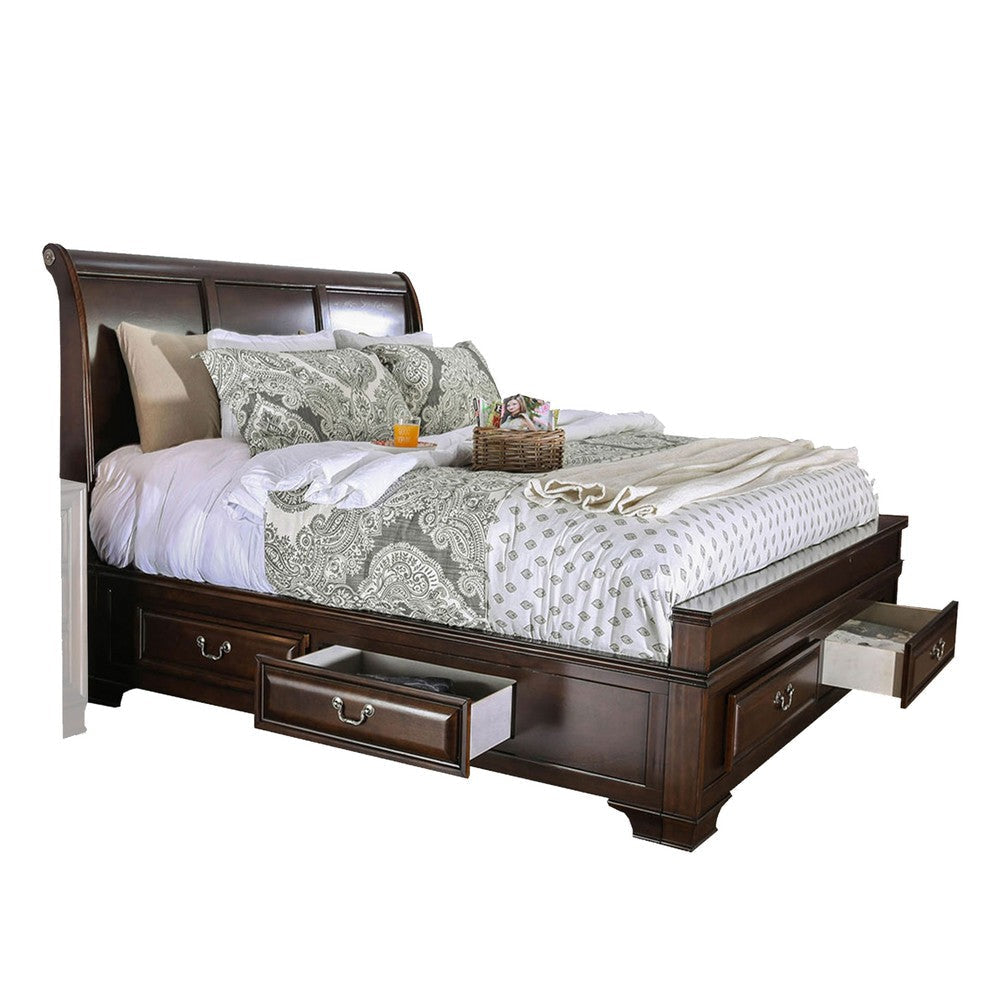 • Classic three panel sleigh headboard with built-in footboard drawers for elegance and convenient storage