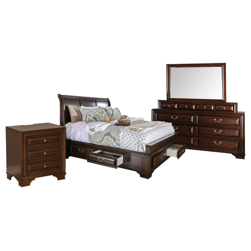 Elevate your bedroom with this Lio four piece king size bedroom set, featuring a cherry brown wood finish and silver metal hanging pulls. Crafted from solid wood, wood veneer, and metal for lasting durability, this set includes a king bed, nightstand with USB and power outlets, and a ten-drawer dresser with a matching mirror. Enjoy built-in footboard drawers, cedar-lined storage, and elegant antique-style hardware in a transitional design with classic and modern touches.