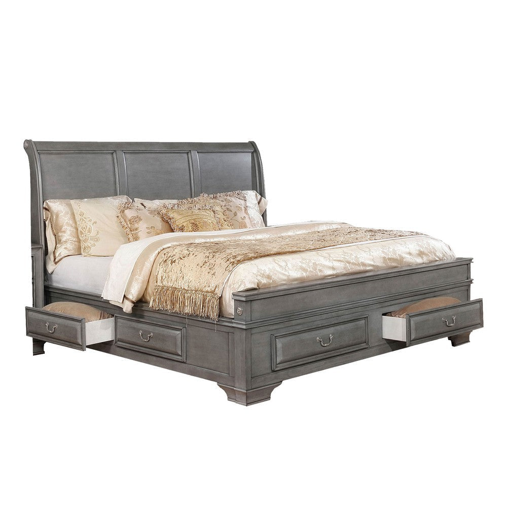 Elevate your bedroom with this Lio four piece queen size bedroom set, featuring a chic gray wood finish and nickel metal hanging pulls. Crafted from solid wood, wood veneer, and metal for lasting durability, this set includes a king bed, nightstand with USB and power outlets, and a ten-drawer dresser with a matching mirror. Enjoy built-in footboard drawers, cedar-lined storage, and elegant antique-style hardware in a transitional design with classic and modern touches.