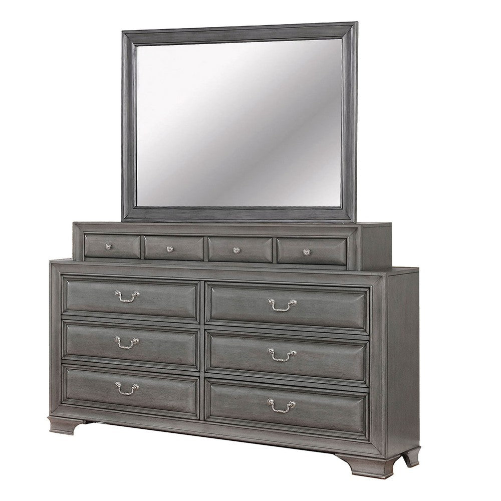 • Three drawer nightstand and ten drawer dresser with a mirrror adorned with ornate molding and antique-style nickel finished hardware for a cohesive look