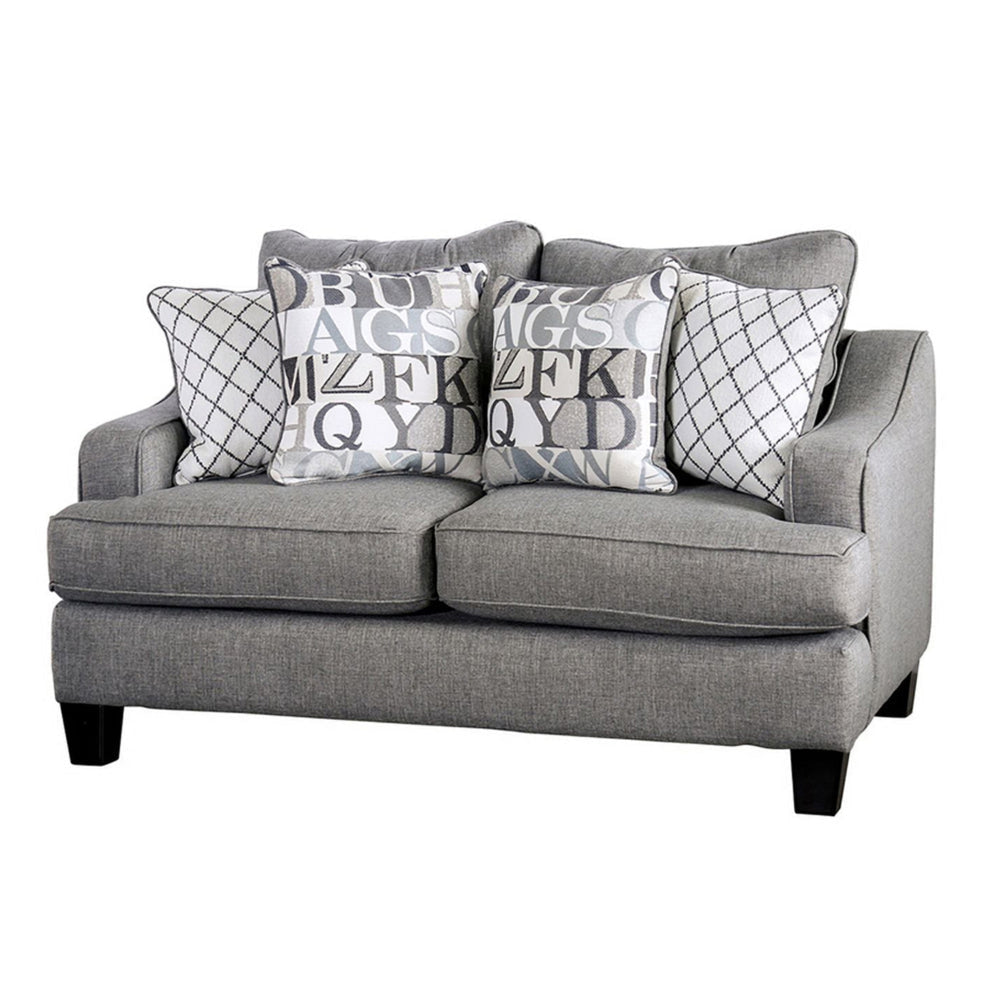 • Upholstered in bluish gray stain-resistant linen-like fabric for durability and elegance