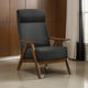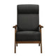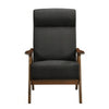 Experience the comfort of this high back accent armchair from our Mary collection, featuring a solid rubberwood frame and black polyester upholstery. This chair features subtly sloped wood arms and legs in brown finish, all with a sleek silhouette. It has foam padding over pocket coil seating with attached back and seat cushions. Check out our Mary collection for more.