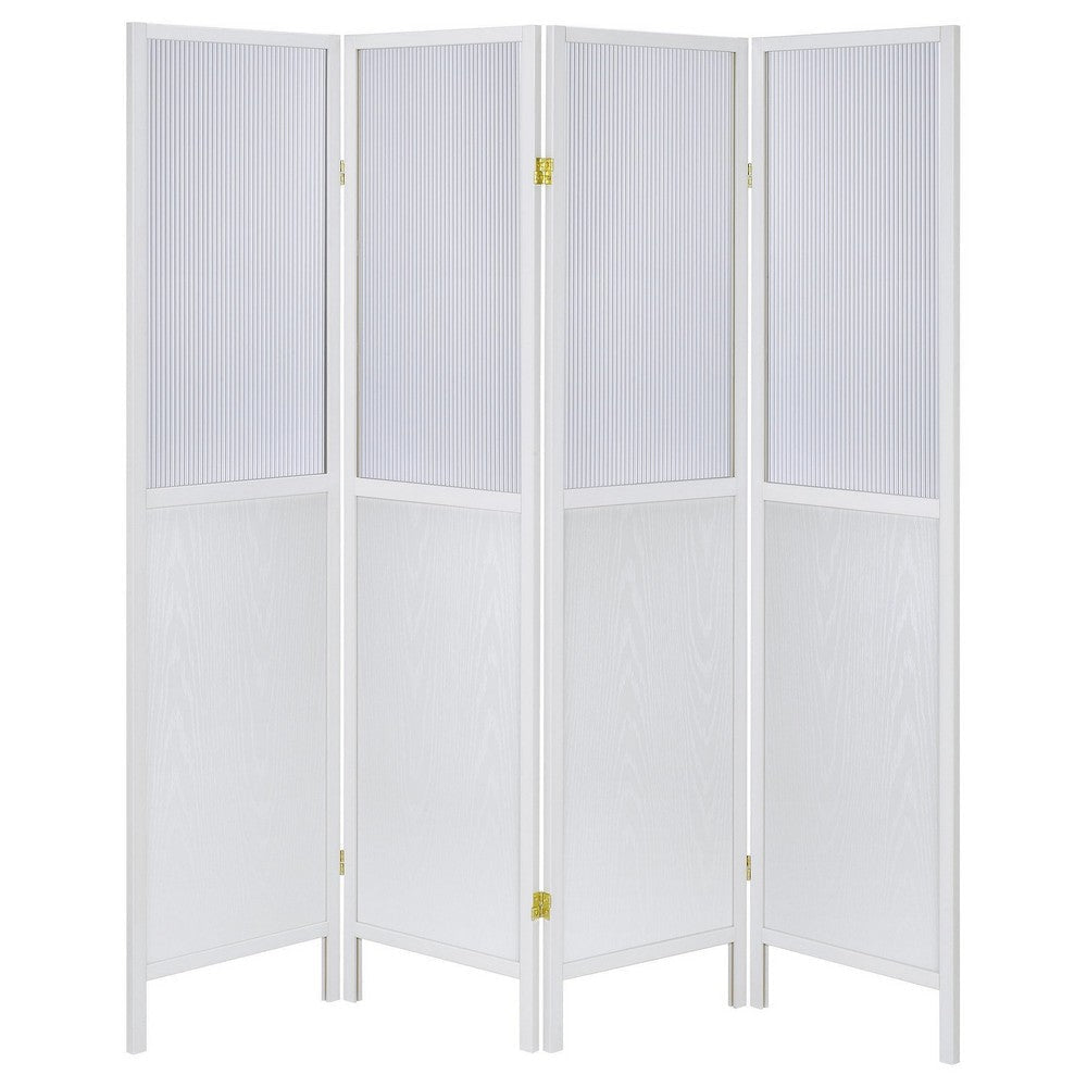 Create functional spaces with this four-panel screen featuring a transitional design. This freestanding divider has four tall panels with semi-opaque upper sections that softly diffuse light. Its neutral frame and solid lower panels finished with subtle wood grain, offer privacy and a touch of dimension. Check out our Matt collection for more options.