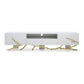 Description:Elevate your home lounge or theater setup with our Mene TV media entertainment console. Constructed with a fusion of wood and metal, this console ensures unparalleled stability and durability. This stand boasts an open shelf, a drawer, two-door shelves, and branch-style champagne gold accent base support for stability and charisma. Check out our Mene collection for more.