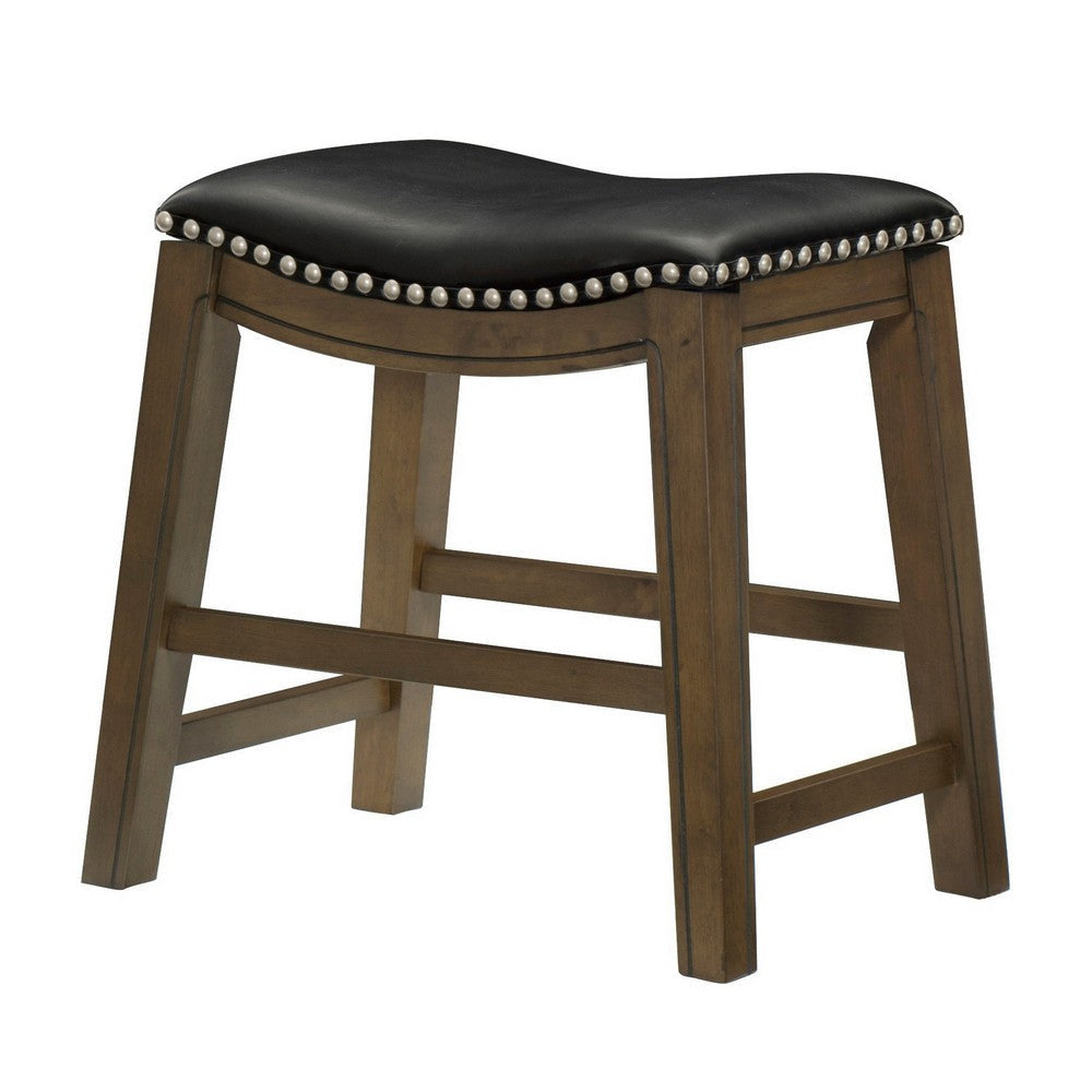 Add a touch of elegance and comfort to your home with this saddle style dining stool. It has a solid wood frame in a rich brown finish, a black faux leather upholstered seat with a plush foam cushion, and a sturdy base with a footrest. The seat edges are adorned with nailhead trim while the wood legs and seat apron have a routed accent for a refined look. Check out our Meil collection for more.