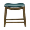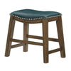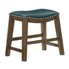 Add a touch of elegance and comfort to your home with this saddle style dining stool. It has a solid wood frame in a rich brown finish, a green faux leather upholstered seat with a plush foam cushion, and a sturdy base with a footrest. The seat edges are adorned with nailhead trim while the wood legs and seat apron have a routed accent for a refined look. Check out our Meil collection for more.