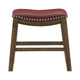 Add a touch of elegance and comfort to your home with this saddle style dining stool. It has a solid wood frame in a rich brown finish, a red faux leather upholstered seat with a plush foam cushion, and a sturdy base with a footrest. The seat edges are adorned with nailhead trim while the wood legs and seat apron have a routed accent for a refined look. Check out our Meil collection for more.
