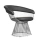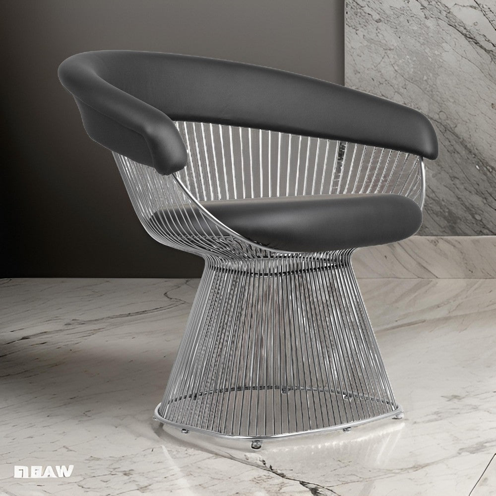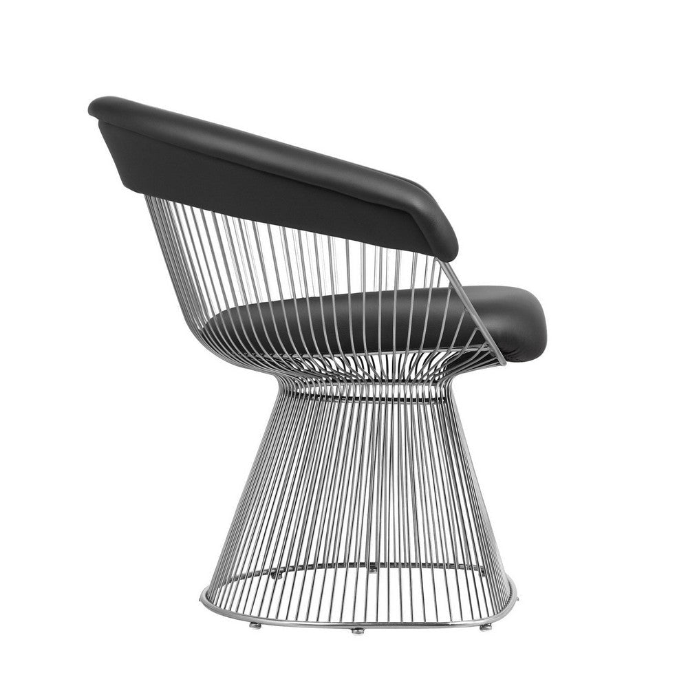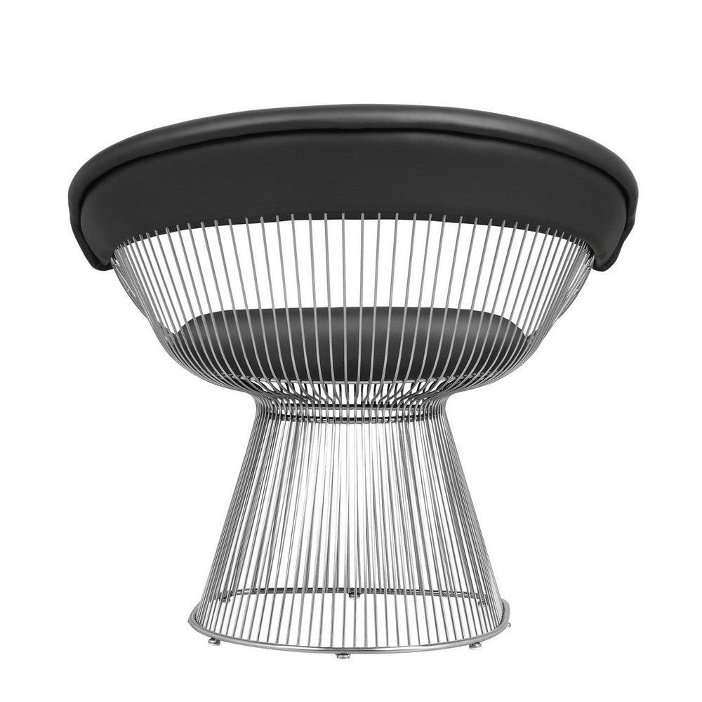 Achieve an iconic contemporary look for your living room or lounge with this armchair from our Mimi collection. This stylish piece features a black faux leather upholstered seat and backrest with foam cushioning and comfortable armrests. This all rests atop a unique cage-like design with a sleek and durable metal frame. Check out our Mimi collection for more color options.