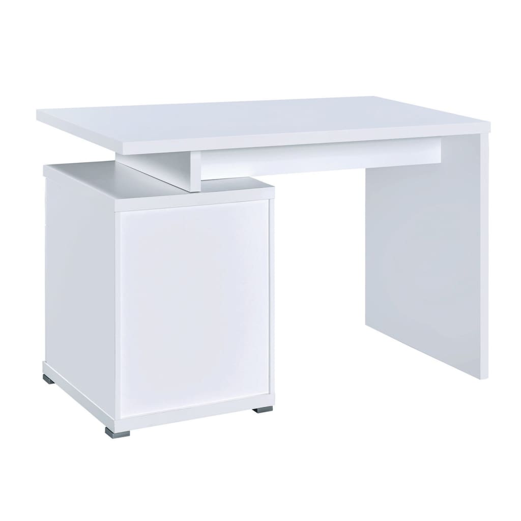 Clean straight lines plus the storage of a built-in cabinet pedestal make this desk stylish and functional. The cabinet includes two shelves and one large bottom drawer. The contemporary desk is reversible so that the cabinet pedestal can be configured on the left or right of the desk to best accommodate your home office work space; featuring a subtle white finish.