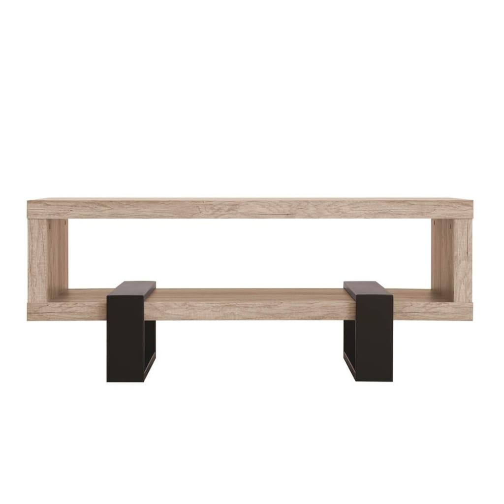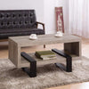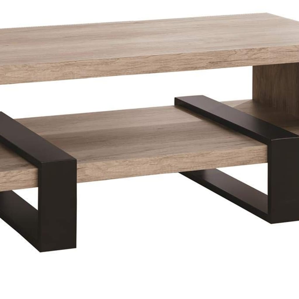 This two-toned coffee table utilizes crisp geometric shapes to create a striking contemporary design. The gray driftwood table top and bottom shelf are supported by two black metal legs perpendicularly aligned to the length of the table.