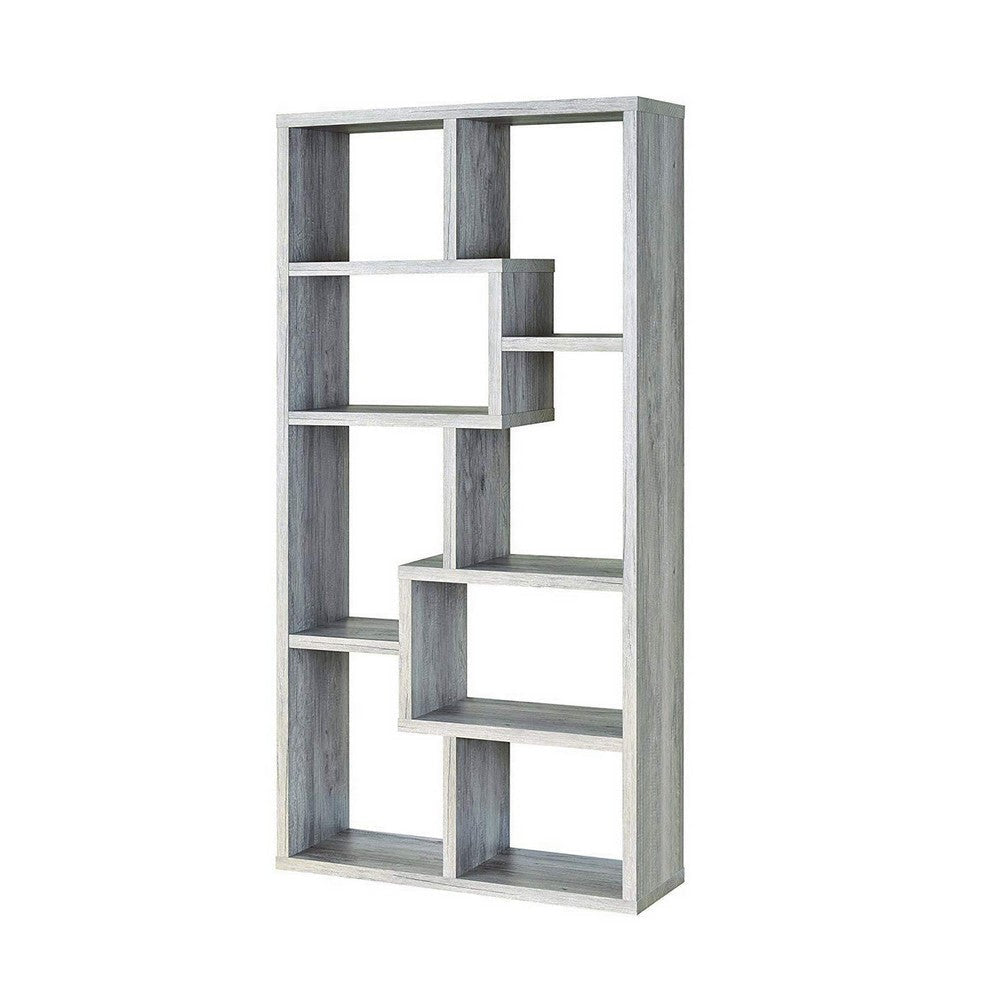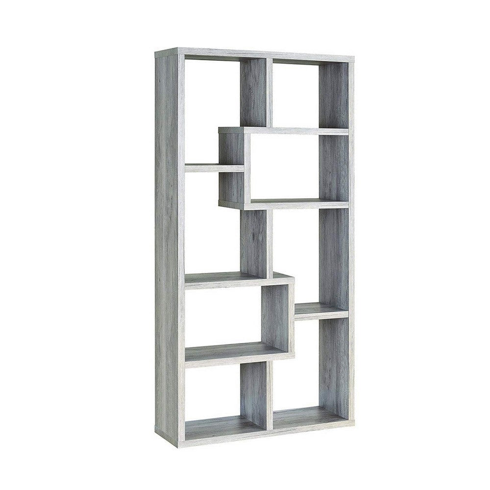 This casual style bookcase is constructed with high grade wood in and has plenty of storage space. This versatile piece features floating display cube shaped shelves. The sleek lines bring out the best features of the wood craftsmanship, which comes in a beautiful natural tone gray finish.