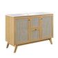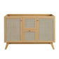 Introduce refreshing style to your restroom with the Soma 48” Bathroom Vanity. Showcasing a beautiful rattan weave on the cupboard doors and drawer fronts, this vanity cabinet brings organic aesthetics and modern functionality to any bathroom or powder room. Crafted from durable MDF and particleboard with a natural wood grain finish, this vanity boasts a ceramic basin with 8-inch centerset holes and an integrated countertop. This vanity features two cupboards with two drawers nestled in between, one thoughtfully spacious and the other decorative and non-functional. Inside each cupboard there’s an adjustable shelf, providing easy customization for arranging towels, toiletries, and bathroom necessities. Complete with metal doorknobs with a brushed gold finish and soft-close hinges, this bathroom vanity cabinet is designed for quiet and effortless functionality. Resting on splayed legs, the Soma Bathroom Vanity includes non-marking foot caps to protect flooring. Assembly required. Fixtures not included. Set Includes: One - Cayman 48" Bathroom Sink One - Soma 48” Single or Double Sink Compatible Bathroom Vanity Cabinet (Sink Basin Not Included)