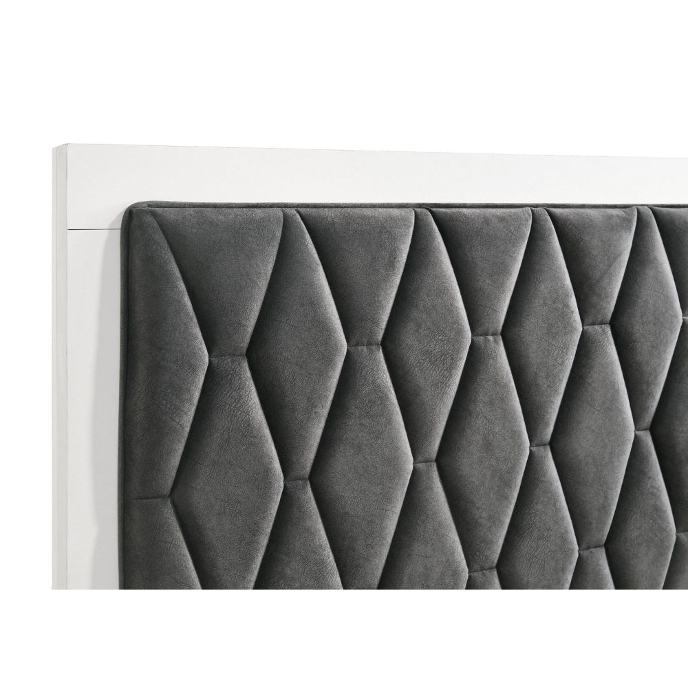 Add a touch of style to your bedroom with this queen bed featuring a hexagonal tufted headboard upholstered in dark gray fabric. The sleek white melamine frame offers a clean, contemporary look, while the padded headboard ensures comfort. It is supported by sleek black metal tubular legs, granting stability. Explore our Noro collection by Casagear Home.