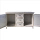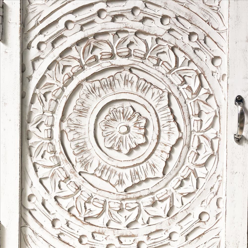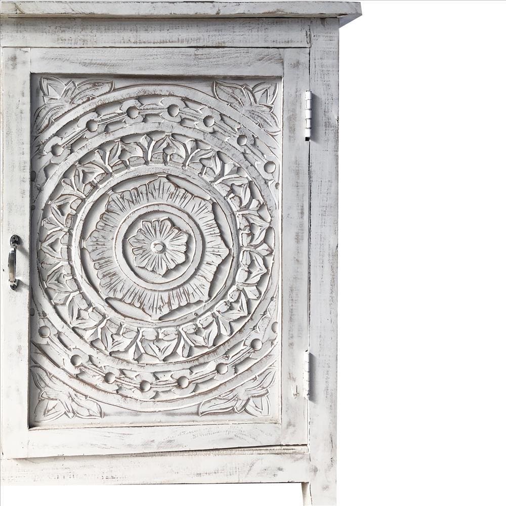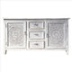 Give your dining space a makeover with this sophisticated, stylish sideboard console buffet. It has three smooth gliding drawers and two cabinets, perfect for storage. This piece is handcrafted from mango wood for lasting durability, accented with an antique white finish, and decorated with gorgeous and intricate floral cut out pattern. The brushed steel handles facilitate easy access to the storage space and the grain details add a subtle, homespun charm to it. The spacious rectangular top offers plenty of room to display decorations and collections alike. Check out our Olta collection for matching and coordinating pieces.