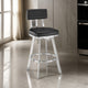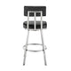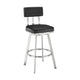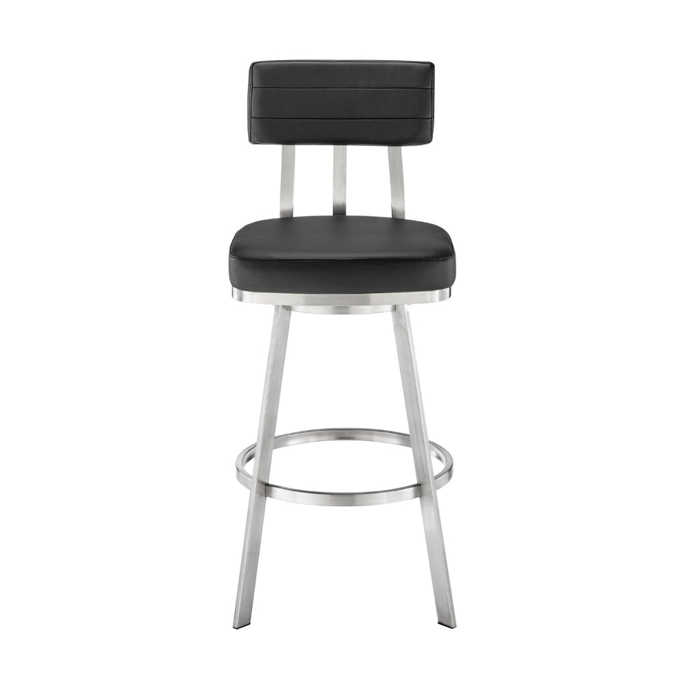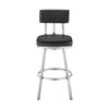 Our Poni counter stool chair boasts a sleek and modern design, featuring a sturdy construction of brushed stainless steel for lasting durability. Its black vegan faux leather upholstery not only adds a touch of sophistication but also promotes sustainability. This is a perfect seating option for your kitchen island or counter height table. Check out our Poni collection for more.