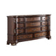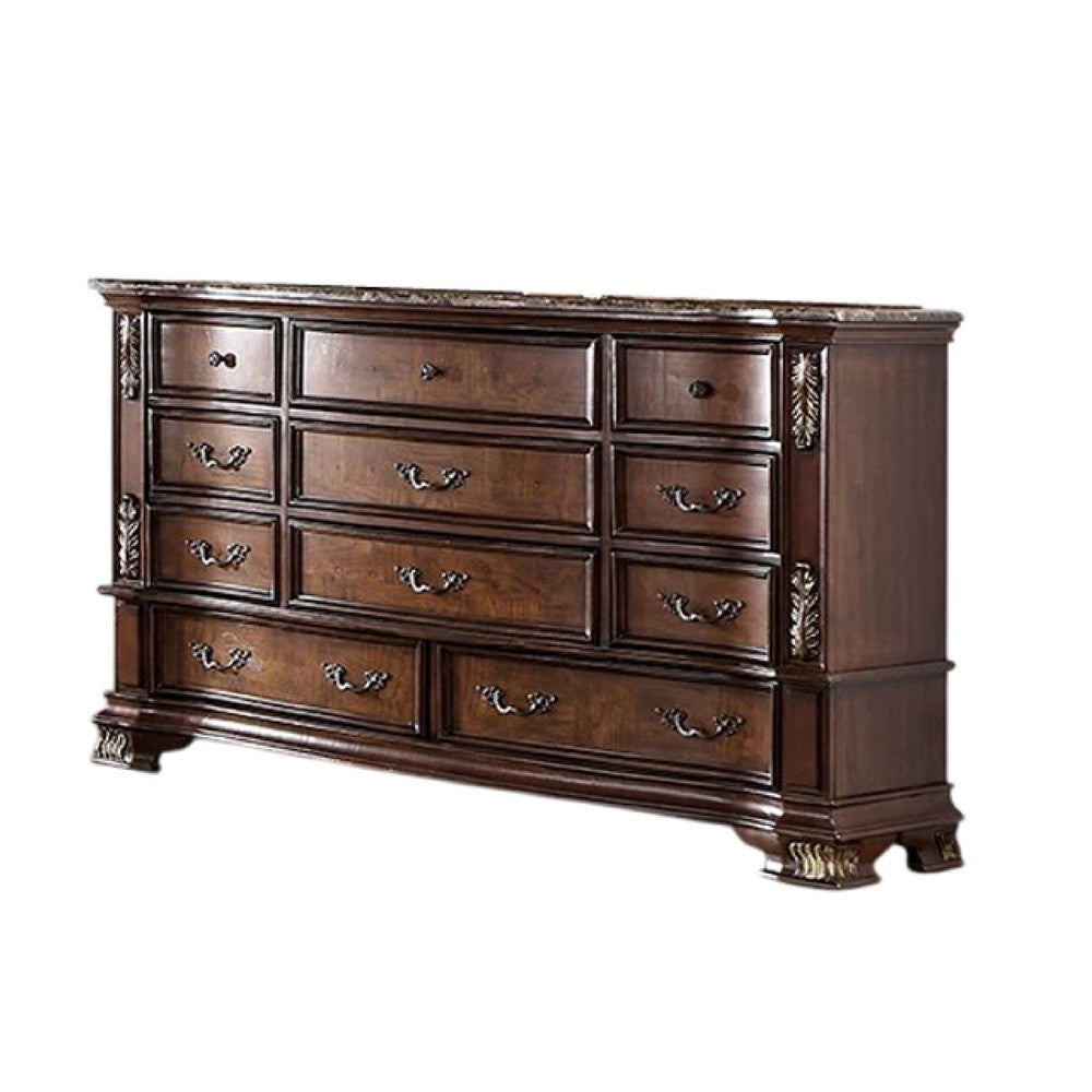 Prio Wide Dresser, 11 Drawers, Marble Top, Carved Cherry Brown Wood