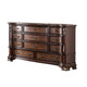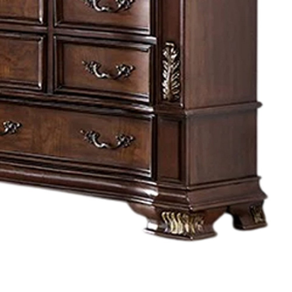 Make a grand statement with the Prio wide dresser, crafted from solid wood and polyresin in a rich cherry brown finish. Eleven drawers glide smoothly on ball-bearing tracks, with felt-lined top drawers for delicate items. Intricate faux wood carvings, pull handles, and a molded frame add regal charm. Supported by carved feet for stability. Explore our Prio collection for more.