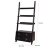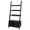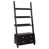 Three graduating open shelves provide ample room to display pictures, decorative pieces, or books with tipping hardware included for further stability when placed against a wall . Four convenient storage drawers accented with sleek silver metal handles adds even more space to put away accessories within easy reach. A contemporary design in a rich cappuccino finish, the exquisite symmetry of this ladder bookcase adds style to a living room, home office, or hallway. It does not include any other featured product other than a Bookcase.