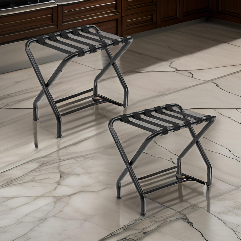 Description:This convenient set of two foldable luggage suitcase racks, constructed from sturdy steel and durable black fabric, offers a practical solution for shoe storage and more. Their collapsible design allows them to fold flat, making them easy to stow away under the bed or in a closet. Each one has four slatted fabric shelves for air flow and easy transportation. Check out our Rami collection for more.