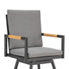 Our Razi swivel barstool chair is meticulously crafted with classic black aluminum for a style that seamlessly integrates with modern outdoor or indoor styles. The gray upholstered cushions not only enhance comfort but add a touch of sophistication with open-style framed arms for support and a visually appealing silhouette. Check out our Razi collection for more options.