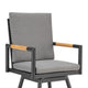 • Rounded open design frame with tan brown teak wood accented armrests for comfortable seating