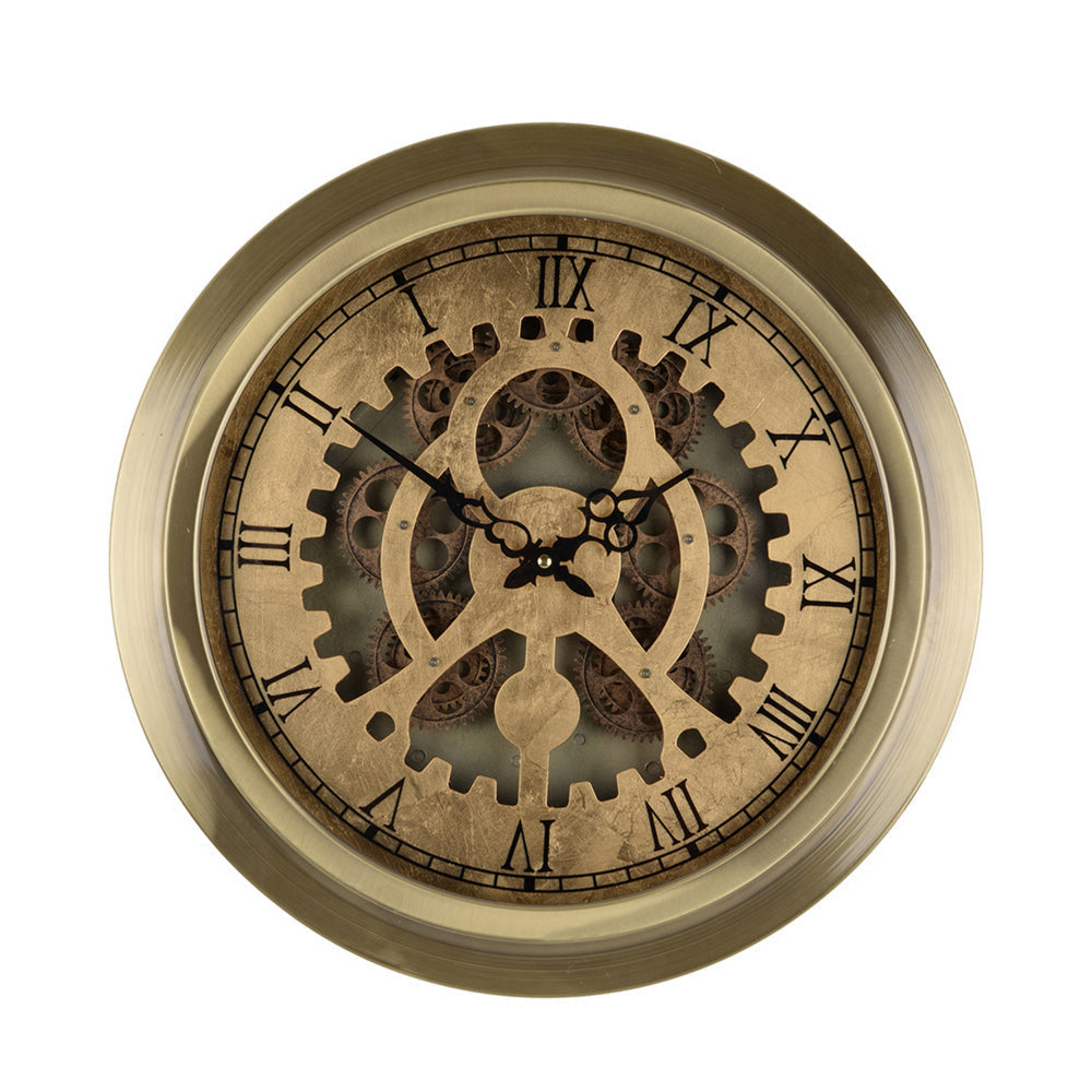 Expand your vision of interior decor by utilizing this captivating decorative wall clocks from our Reny collection. Featuring an open faced round silhouette in gold and bronze tones and a decorative mechanism of smooth gears, this piece has an industrial steampunk inspired look that adds personality and character to your home decor theme. Check out our Reny collection for matching options.