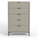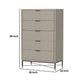 High quality craftsmanship meets contemporary style with this expertly made tall dresser chest in taupe gray and black. With five gliding drawers to keep clothes and linens organized, it has a textured honeycomb pattern on the drawer panels. Crafted from mahogany wood and veneer, it comes with non marking floor protectors. Check out our Rexi collection to complete the set.