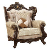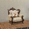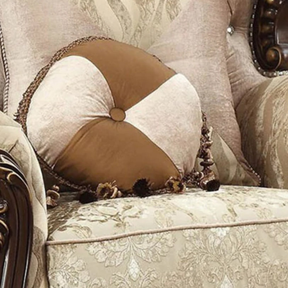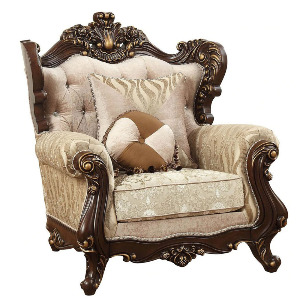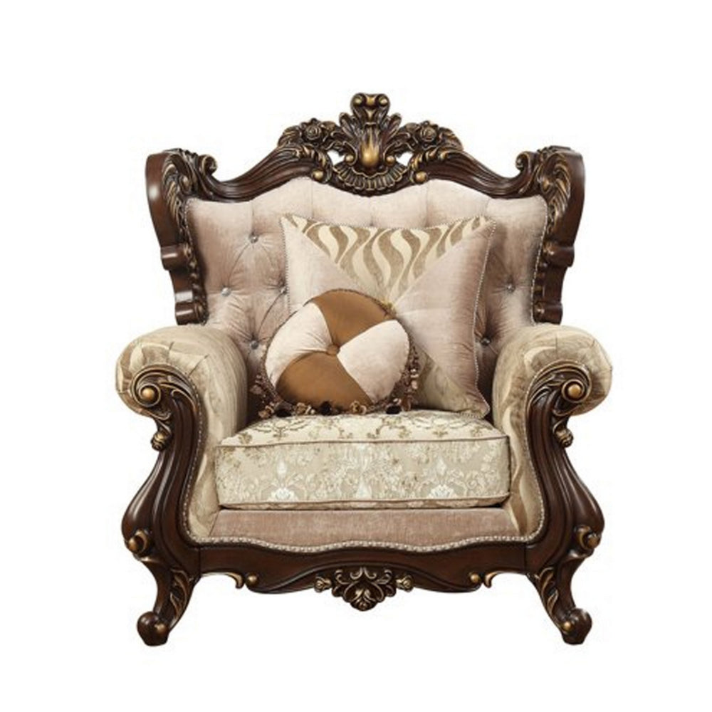 This chair features a traditionally vintage design which will not only style the interior but will also drive the inspirational look of old-time. Featuring a beige fabric upholstery, this chair serves as a distinct contrast to the walnut brown finished sides and legs. Made up of wood and fabric, this comes with two different design and size pillows to offer comfort while seating. This also features floral motif arched backrest with cabriole legs and scalloped bottom edges that offer focal interest. With smart inclusion, this chair is perfect for seating, reading books and relaxing. Does not include any featured product other than one chair with two pillows.
