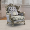 Bring home sophistication with the MiRoyale accent chair. Featuring an antique bronze frame adorned with intricate scroll legs and shell carvings, it embodies classic elegance. The plush gray fabric is accented with button tufting and nailhead trim for texture and visual interest. This chair offers exceptional comfort with soft cushions and a throw pillow. Check out our Royale collection for more.