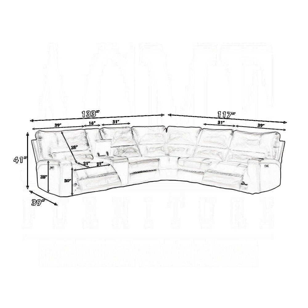 Relax in style with our Saley power motion sectional sofa in espresso brown faux leather. This sofa includes two reclining seats, two armless chairs, a curved wedge, and a console, offering flexible arrangement options. Built with durable materials, it features USB ports on both armrests, and a reversible console with storage and cup holders. Check out our Saley collection for more.