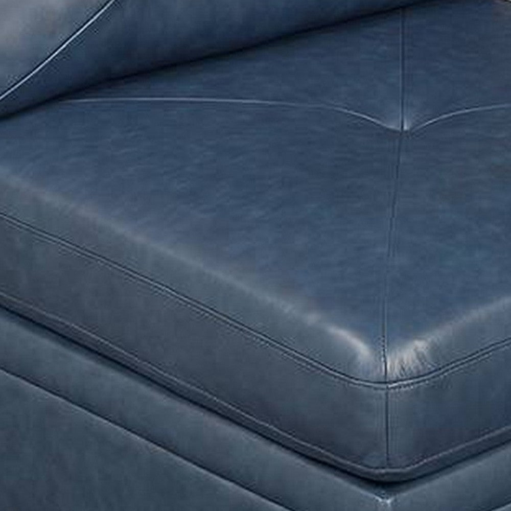 Stylize your interior decor theme wonderfully when you bring home this modular armless sofa chair from our Samy collection. Upholstered in rich blue faux leather, this sofa offers a sleek and modern aesthetic, further accentuated by its comfortably padded seat and back cushions. Its design optimizes space utilization by fitting with other modular pieces. Check out our Samy collection for more.