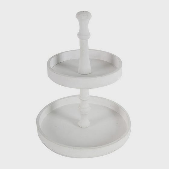 Semy 15 Inch 2 Tier Round Decorative Serving Tray, White Wood Finish By Casagear Home