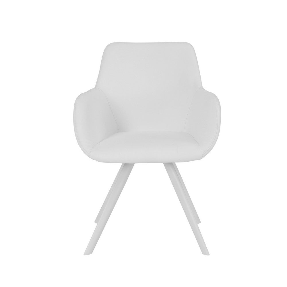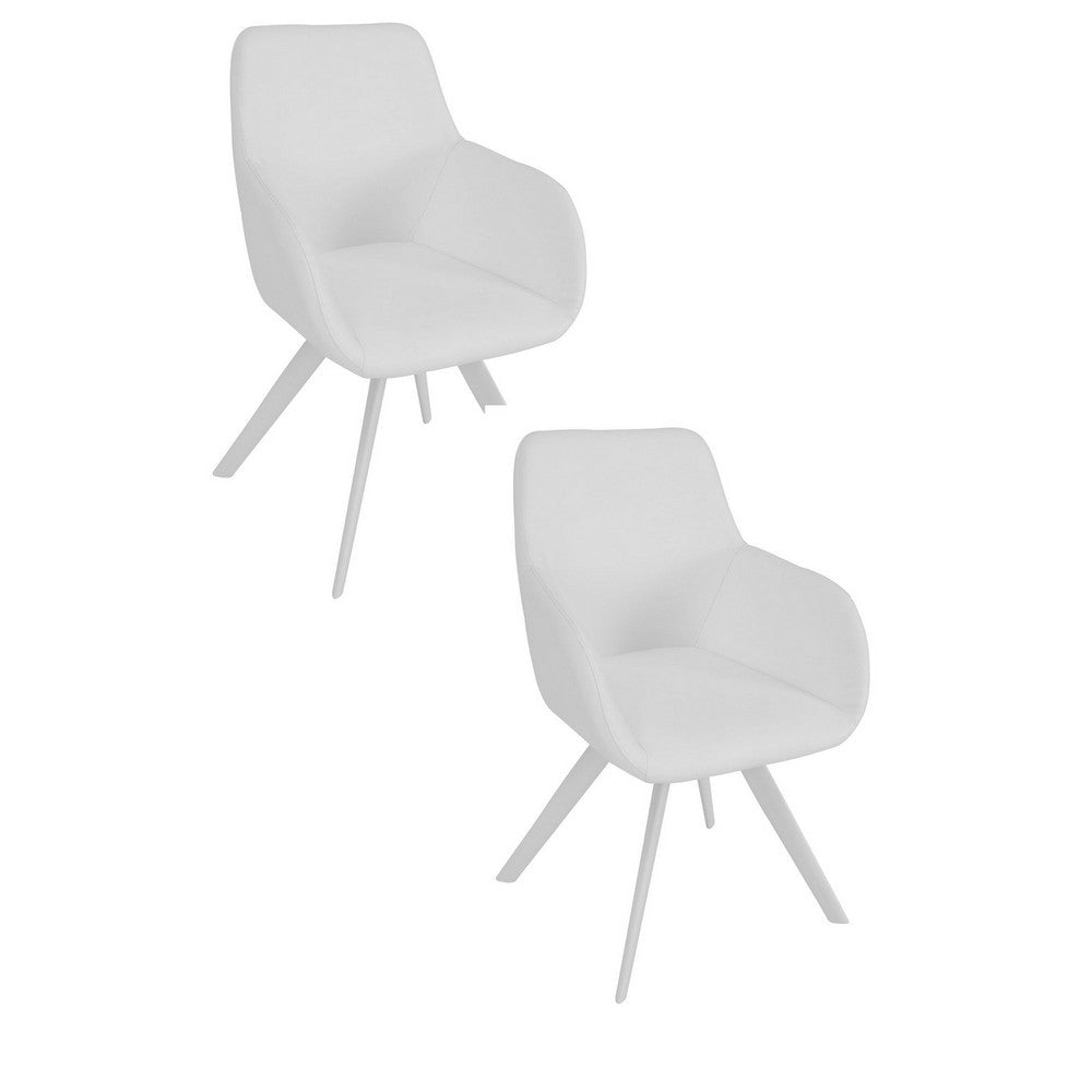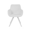Elevate your modern dining room aesthetic with our Simha set of two dining armchairs. Each chair is made with top-quality metal in a crisp white finish. Their round cornered backrests, seats, and arms are filled with 2.0 high-density foam and are upholstered in soft white faux leather to ensure immense comfort and a cozy seating experience. Check out our Simha collection for more color options.